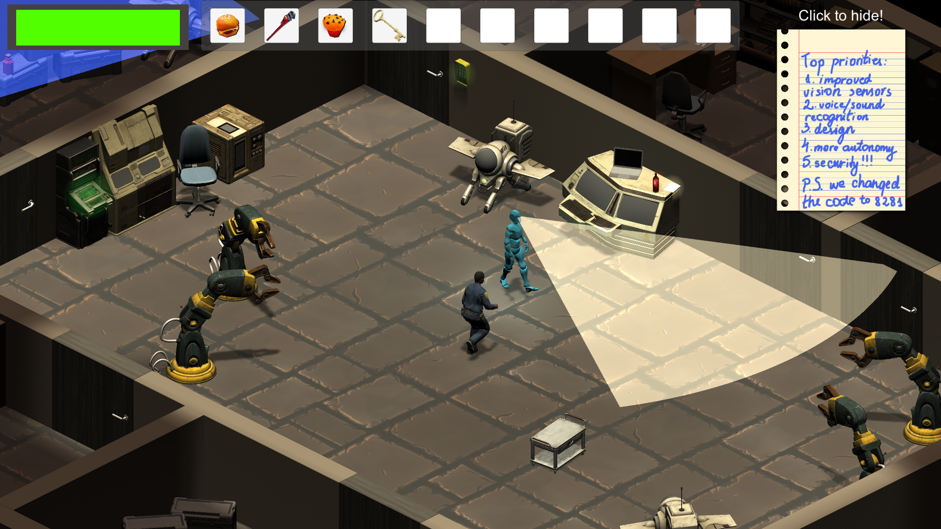 A science facility once filled with friendly and helpful droids became a slaughterhouse after a terrible virus made them go insane. No one knows who is actually responsible for this madness but rogue droids kill everyone and everything on sight. It won't be easy but someone must find a way to end their tyranny and restore peace in this science facility once again.